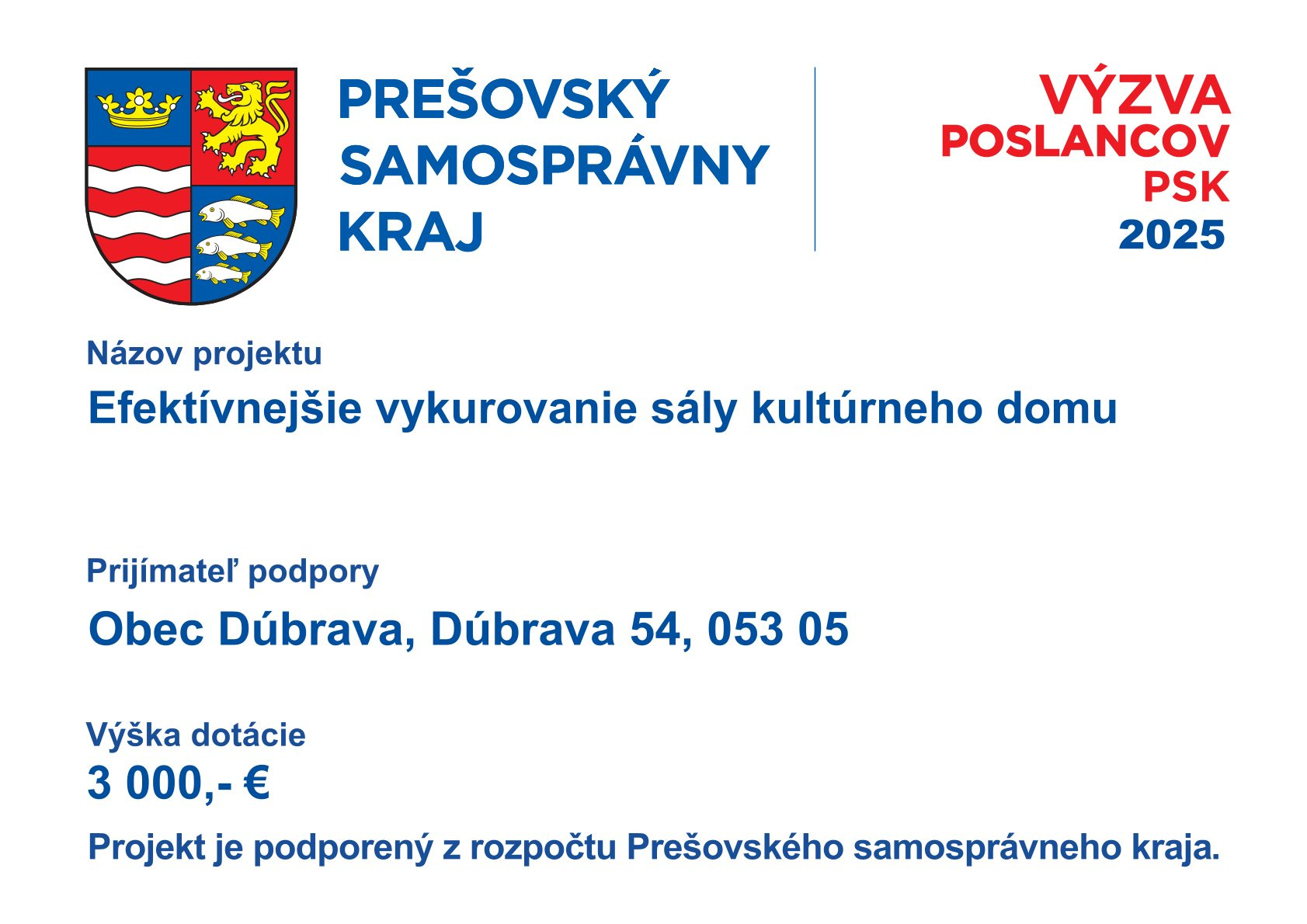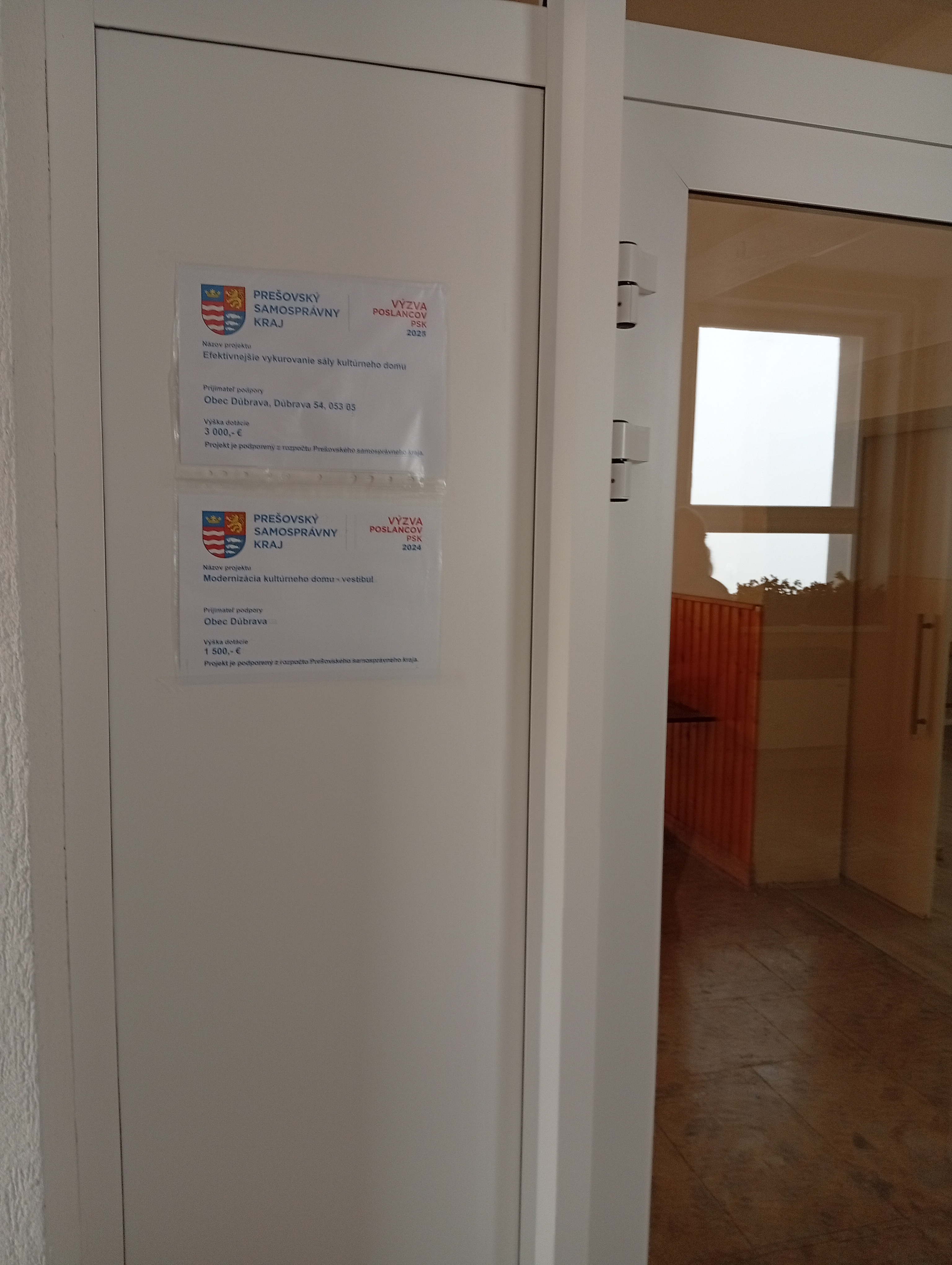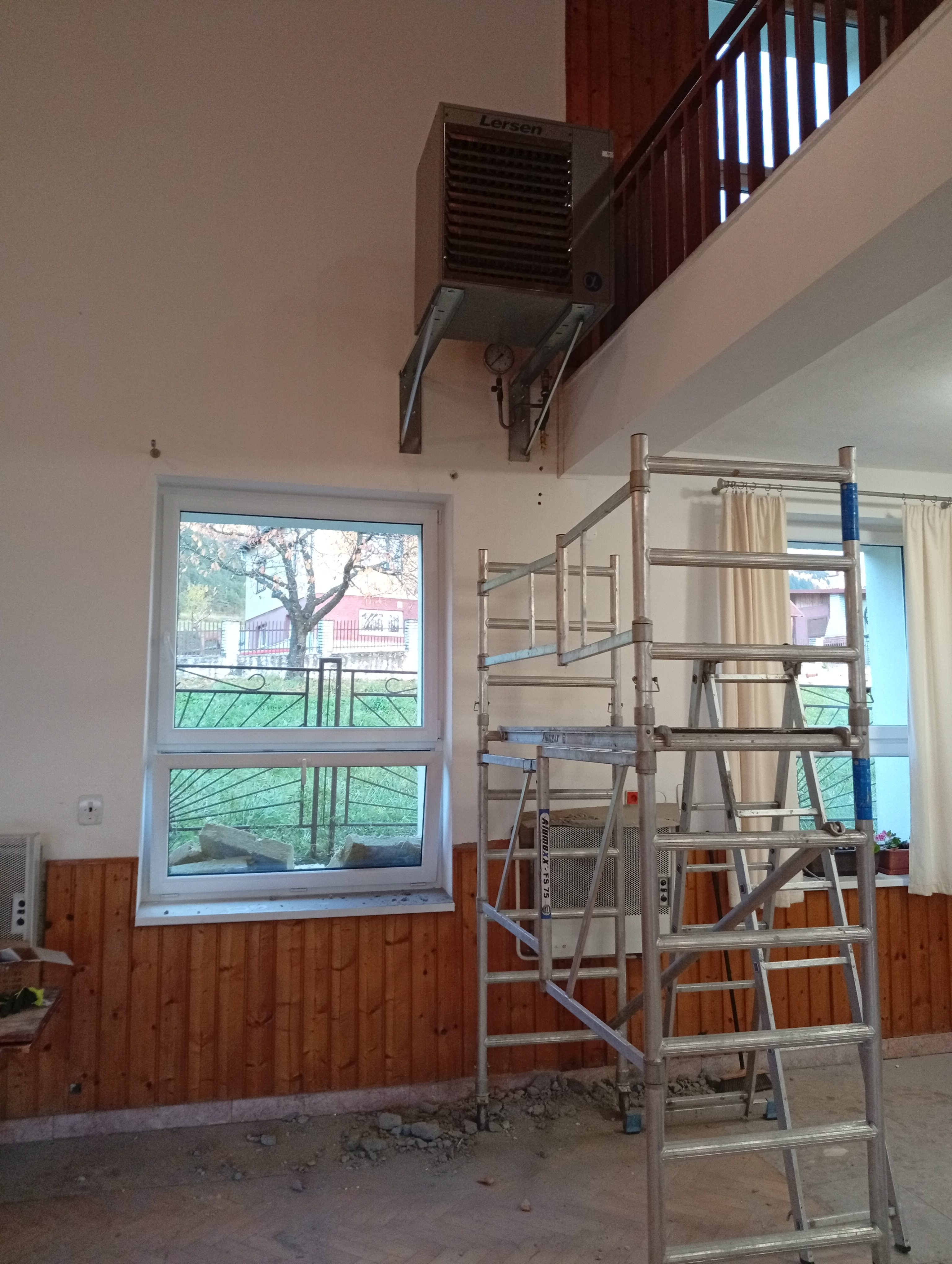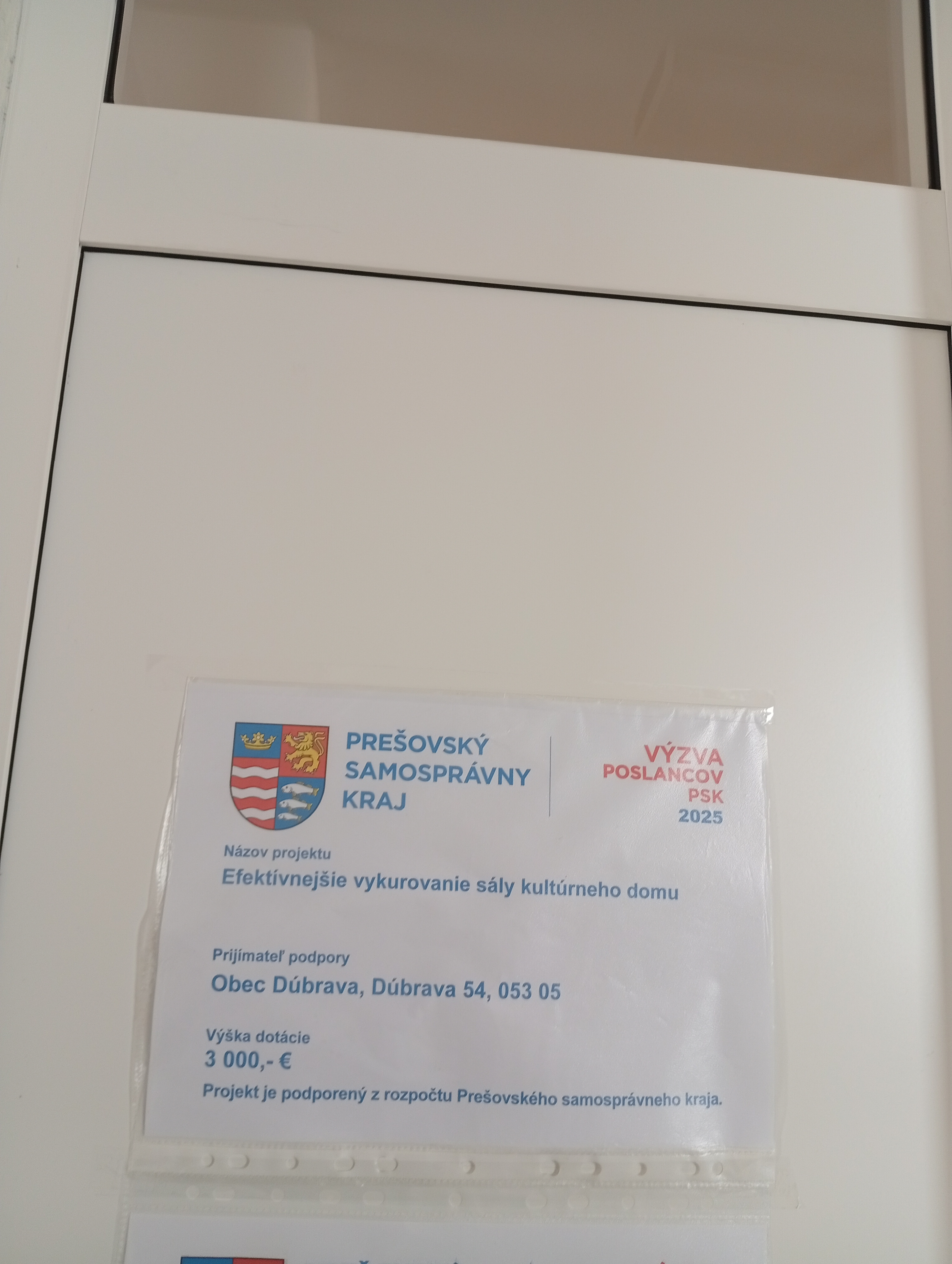 Z dôvodu nepostačujúceho vykúrovania sály kultúrneho domu 5ks plynovými gamatkami, sme podali Žiadosť o podporu Poslancov Prešovského samosprávneho kraja. Dotácia nám bola poskytnutá vo výške 3.000,- €. Po vykonanom prieskumu trhu a dobrých skúsenostiach Obec zakúpila 1 ks Teplovzdušného plynového ohrievača od firmy LERSEN.